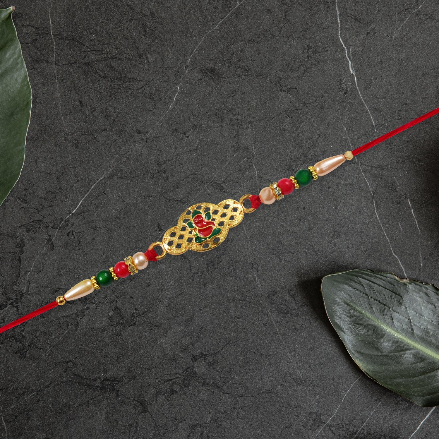 Honor the timeless bond between siblings with our intricately designed Rakhi. Crafted with care and elegance, this Rakhi blends traditional charm with modern aesthetics. Whether you're near or far, send your love and blessings with this exquisite thread of affection.