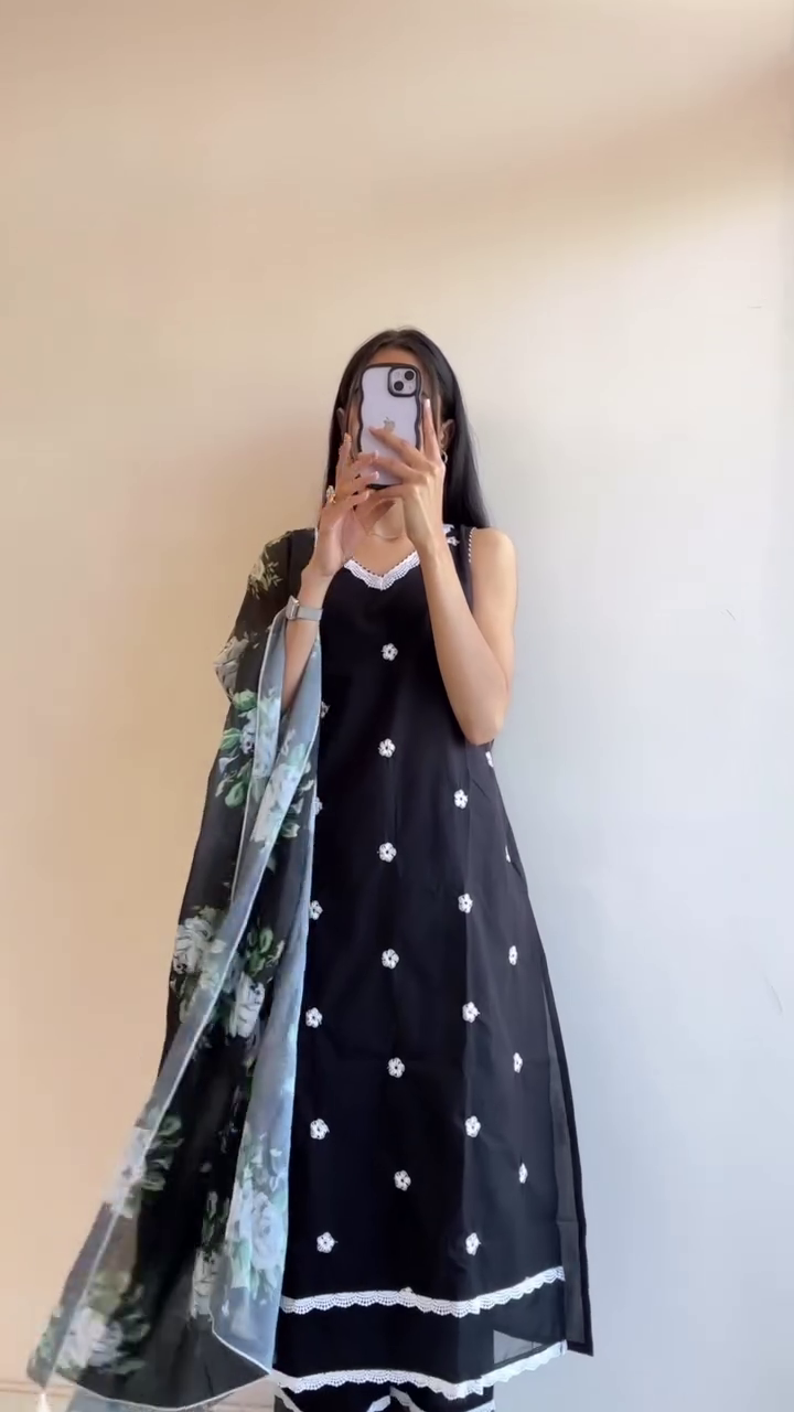 Elegant Cotton Suits in Black and Blue with Delicate White Embroidery and Lace Detailing, Perfect for Casual and Festive Occasions