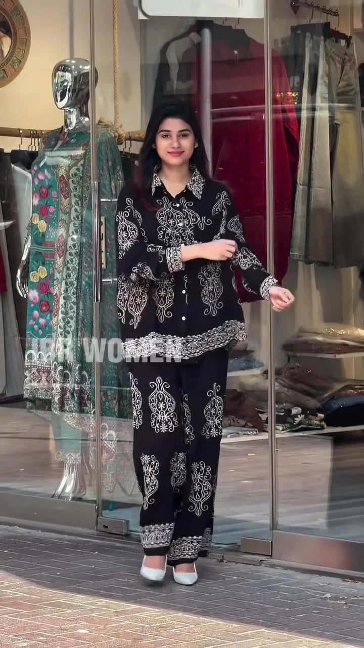 Black Set: Features intricate white embroidery with detailed borders for a bold, ethnic-inspired statement