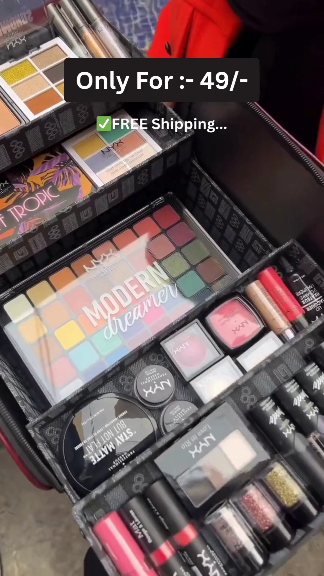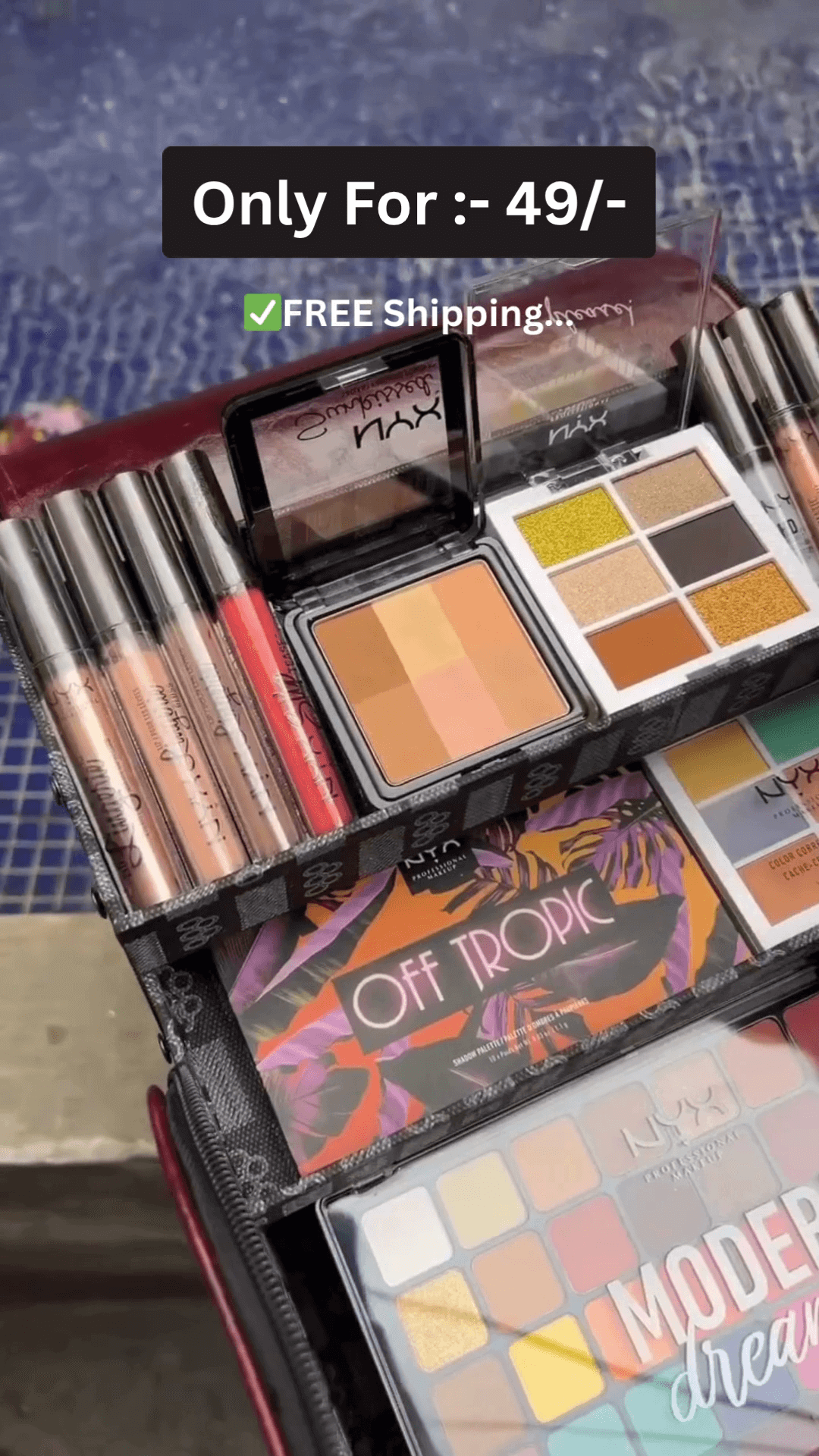 High-quality NYX "Modern Dreamer", "Off Tropic", and other eyeshadow palettes included