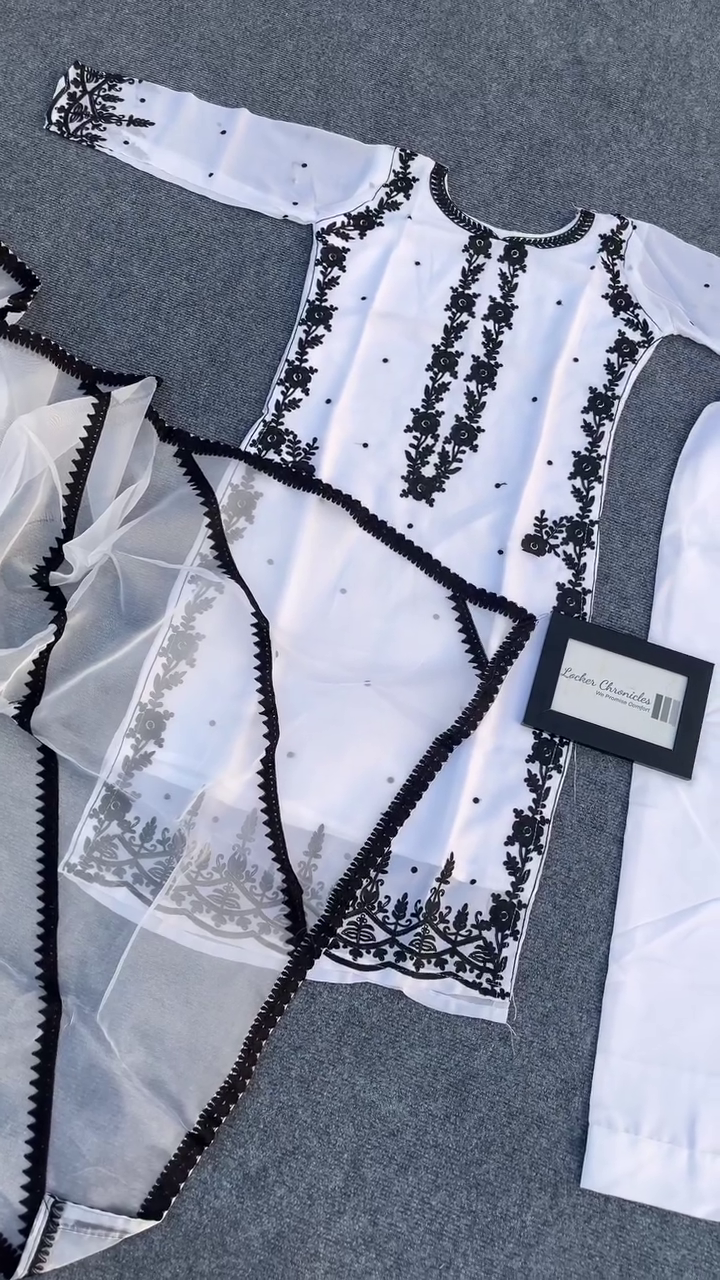 White Kurti Pant Set in Georgette With Black Thread Embroidery and Dupatta