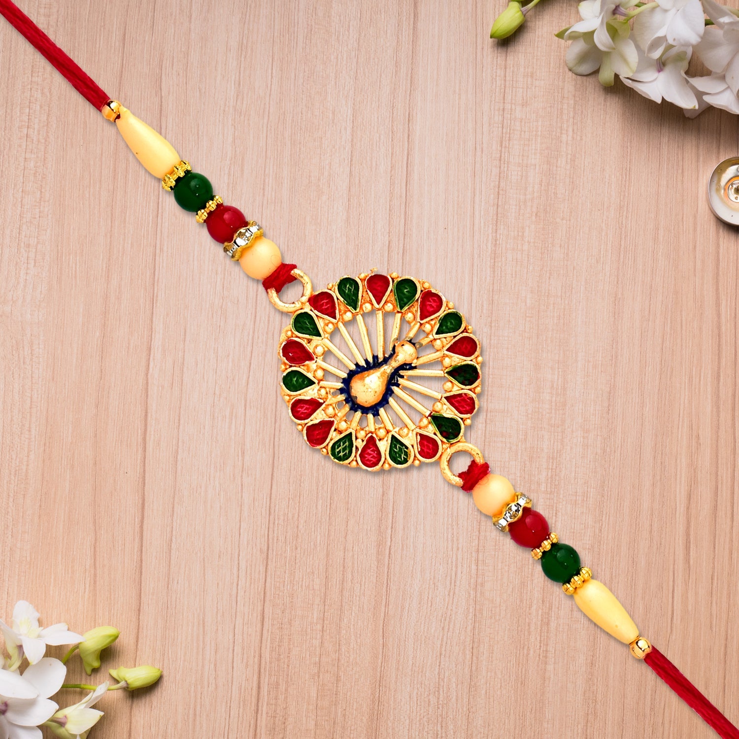 Honor the timeless bond between siblings with our intricately designed Rakhi. Crafted with care and elegance, this Rakhi blends traditional charm with modern aesthetics. Whether you're near or far, send your love and blessings with this exquisite thread of affection.