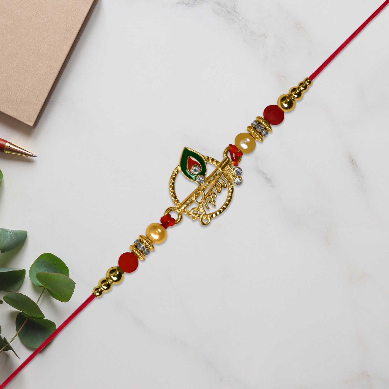 Honor the timeless bond between siblings with our intricately designed Rakhi. Crafted with care and elegance, this Rakhi blends traditional charm with modern aesthetics. Whether you're near or far, send your love and blessings with this exquisite thread of affection.
