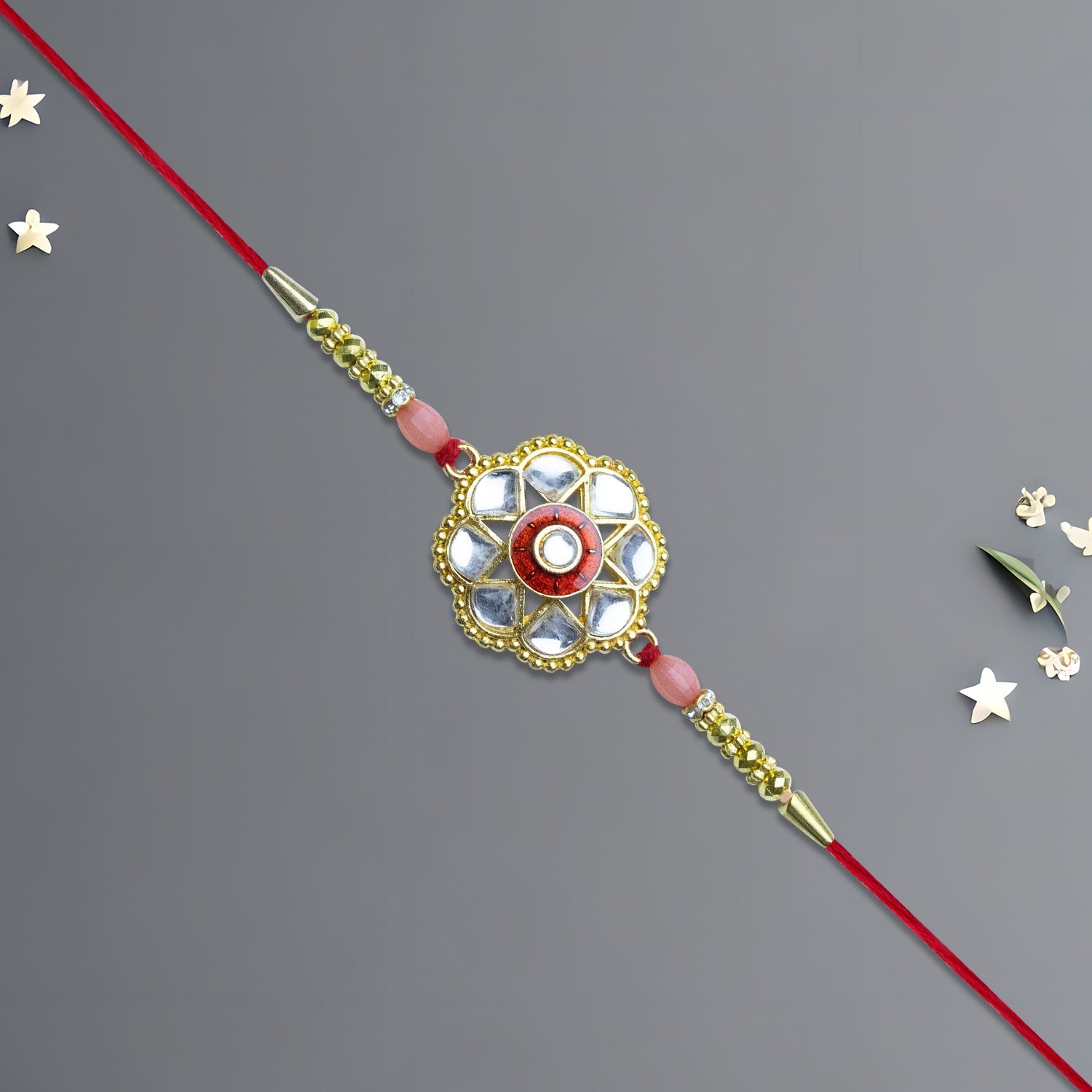 Honor the timeless bond between siblings with our intricately designed Rakhi. Crafted with care and elegance, this Rakhi blends traditional charm with modern aesthetics. Whether you're near or far, send your love and blessings with this exquisite thread of affection.